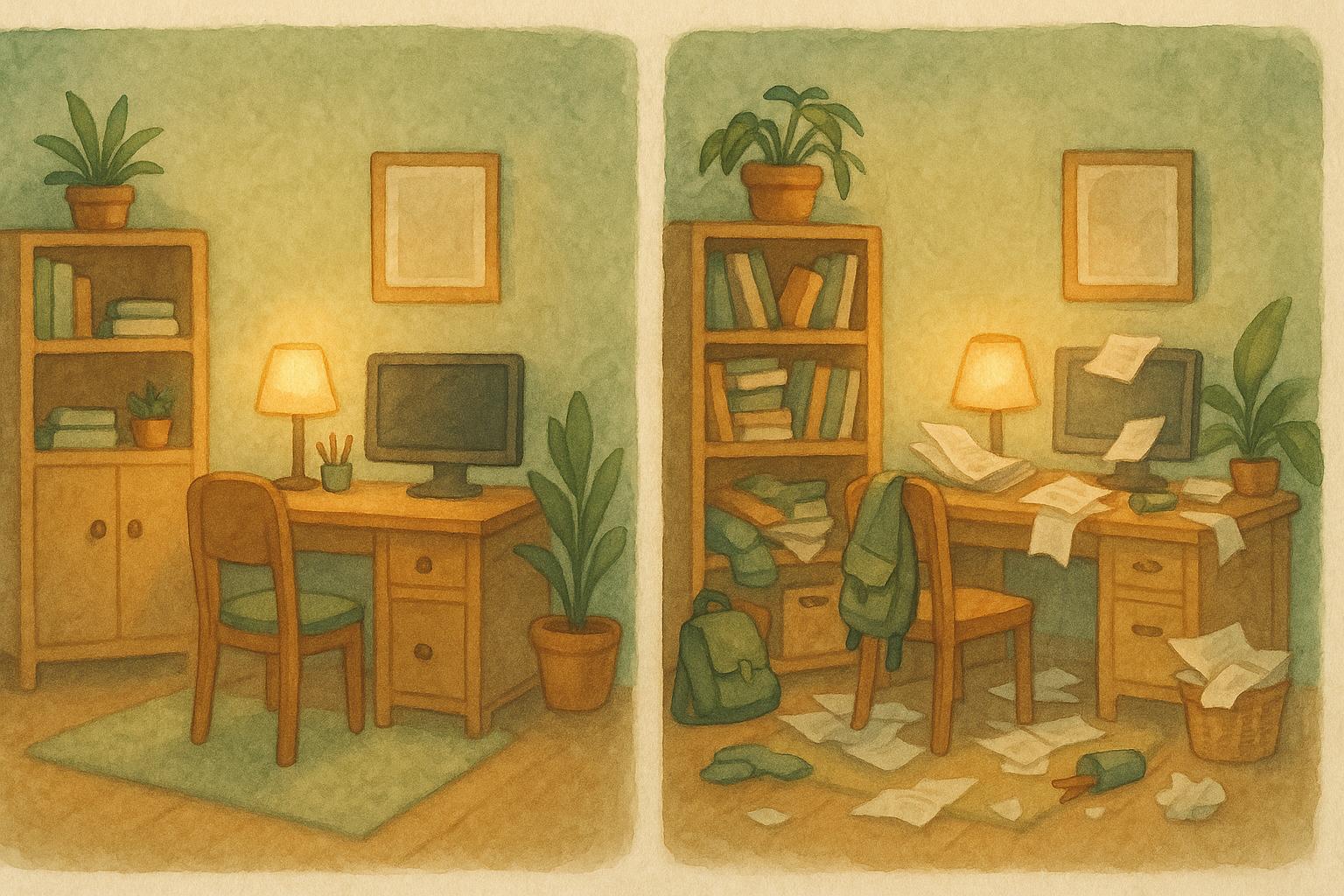 - Escritório em casa desorganizado — quem trabalha em home office sabe como bagunça afeta produtividade.